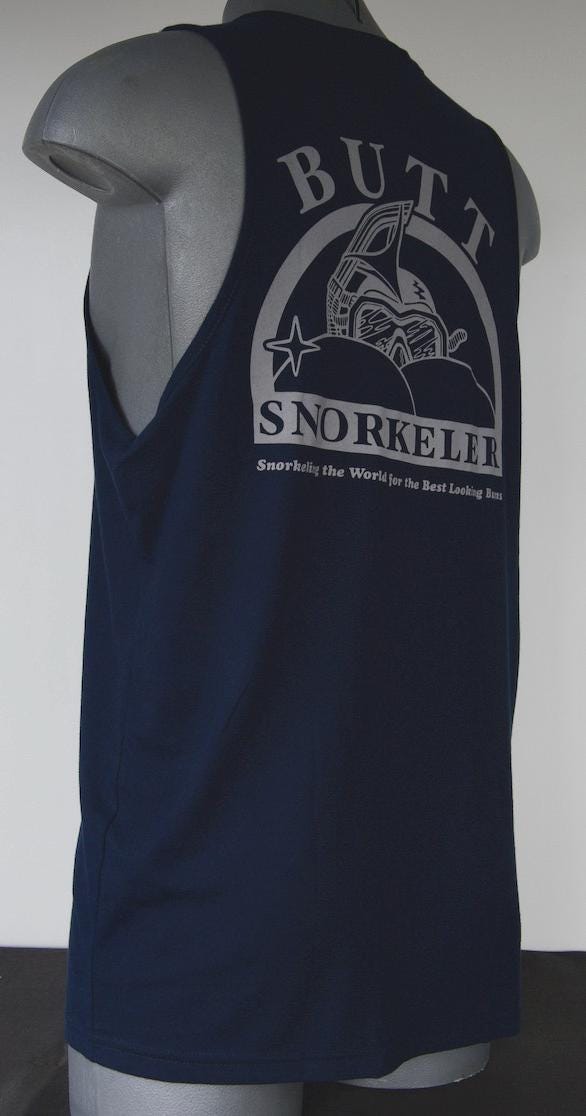 "Butt Snorkeler" T-shirts, Made in the USA using 100% NAFTA certified cotton. A beach-born brand, Butt Snorkeler has always been - and always will be - about having fun, and the love of great buns. Ladies, keep inspiring us...Fellas, keep snorkeling...and we'll keep doing what we do best...Staying classy. All T-shirts in sizes S to XXL, while stocks last! Let people know your a Legend by proudly wearing ButtSnorkeler. The Booty positive apparel.