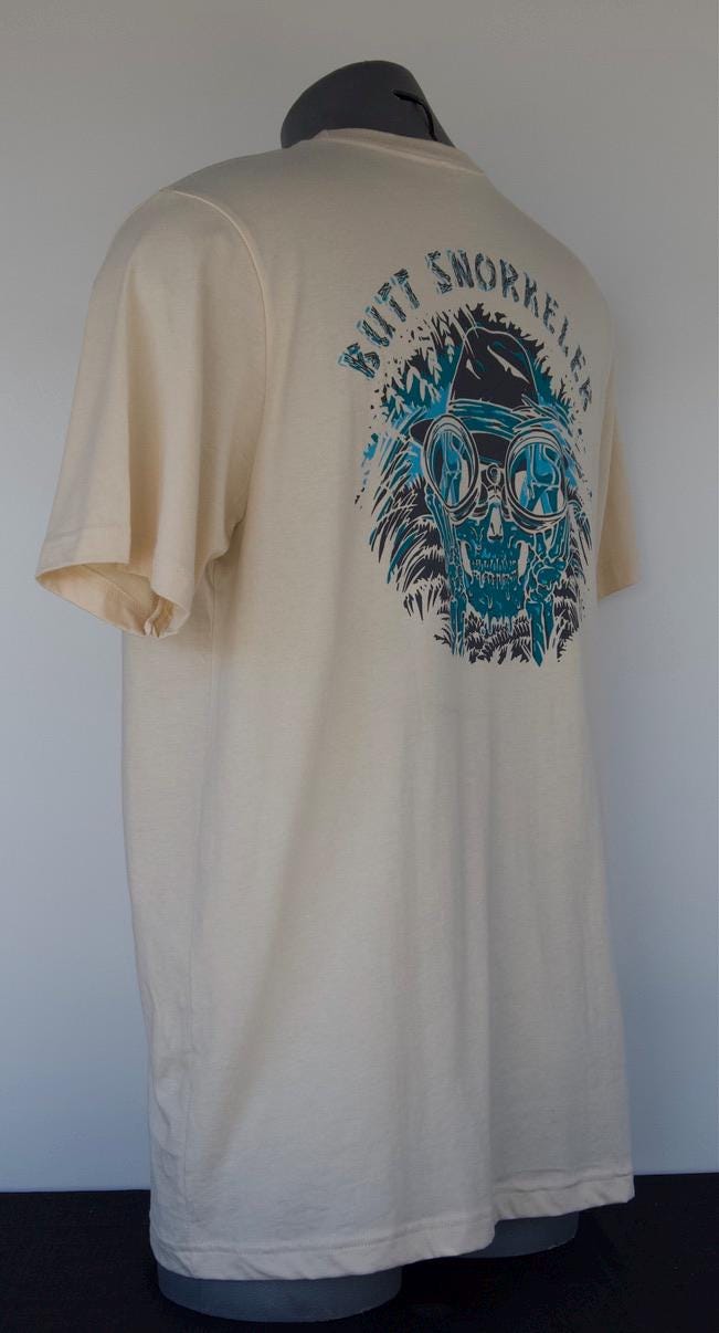 "Butt Snorkeler" T-shirts, Made in the USA using 100% NAFTA certified cotton. A beach-born brand, Butt Snorkeler has always been - and always will be - about having fun, and the love of great buns. Ladies, keep inspiring us...Fellas, keep snorkeling...and we'll keep doing what we do best...Staying classy. All T-shirts in sizes S to XXL, while stocks last! Let people know your a Legend by proudly wearing ButtSnorkeler. The Booty positive apparel.